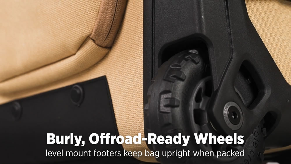 The wheels have been designed for not only city towing but whatever terrain your adventures have taken you to. Level mount footers keep the bag upright when standing still.