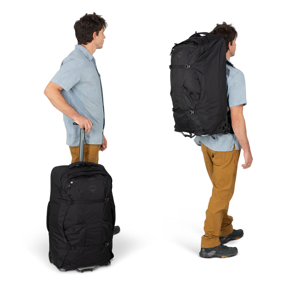 The wheeled version of the Farpoint gives you the option to carry it on your back or wheel it along. Our combo pack also adds the fully compatible Farpoint daypack which can be attached to both the main body of the wheeled pack or buckled to the shoulder straps which keeps your travel essentials close at hand.
