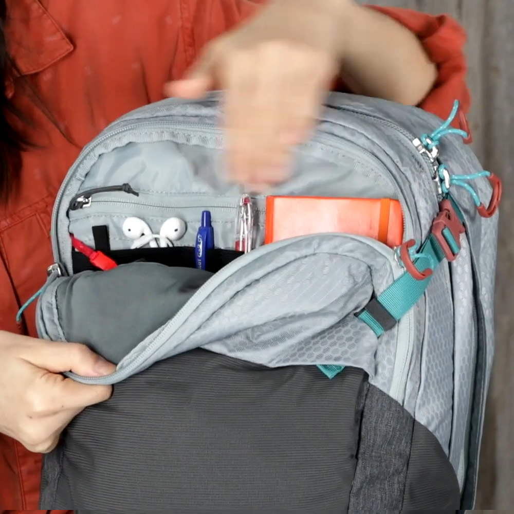 The front zippered section houses an internal organiser, zippered pocket and then has additional storage space for smaller travel accessories such as guidebooks and snacks.